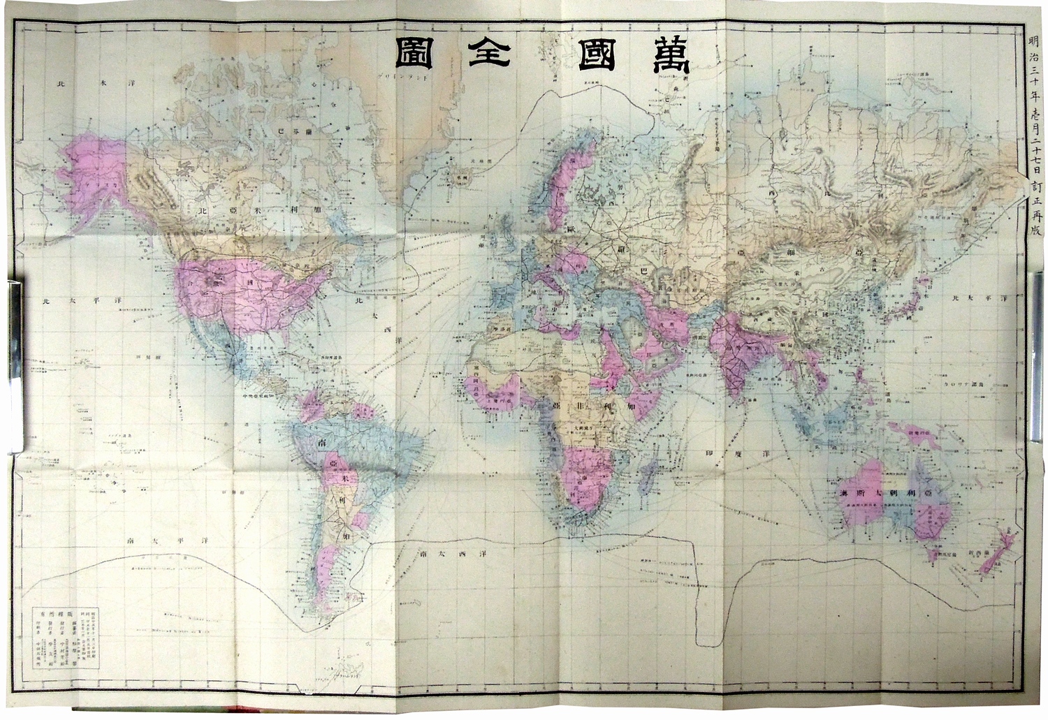 [週刊 萬巻]萬国全図|モズブックス 投稿日時: 2012年7月3日 投稿者: osaka-koshoken 書名:萬国全図 著者:野際馨(編纂) 出版:中村鐘美堂 刊行年:明治30年、訂正再版 状態: ボール表紙付、保存良好 解説:54×80糎、銅版手彩色 売り切れ Tweet